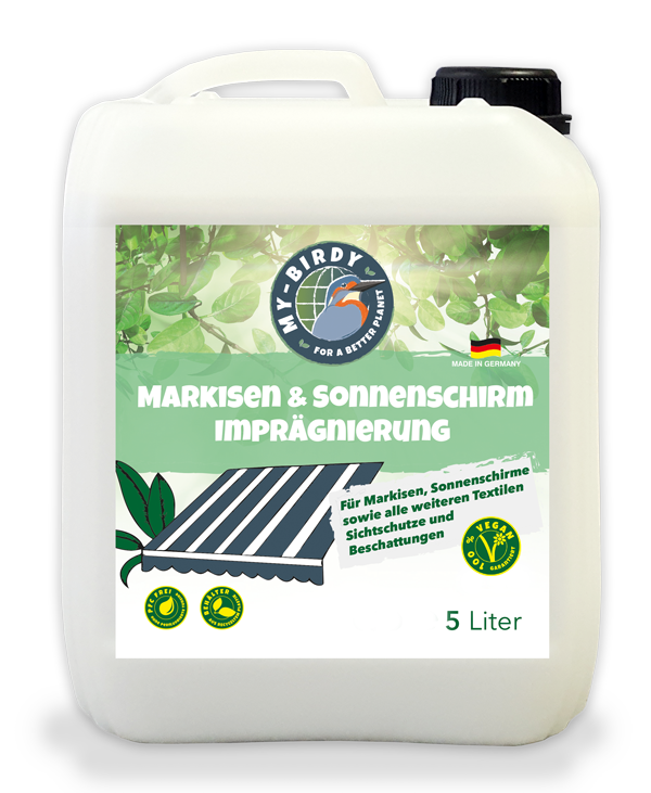 Die My-Birdy Markisen & Sonnenschirm Imprägnierung wirkt schmutz- und wasserabweisend, verhindert Schimmel- und Algenbildung, erhält die Flexibilität des Materials und beugt Ausbleichung vor. Verhindert Stockflecken und die Bildung von Grünbelag.